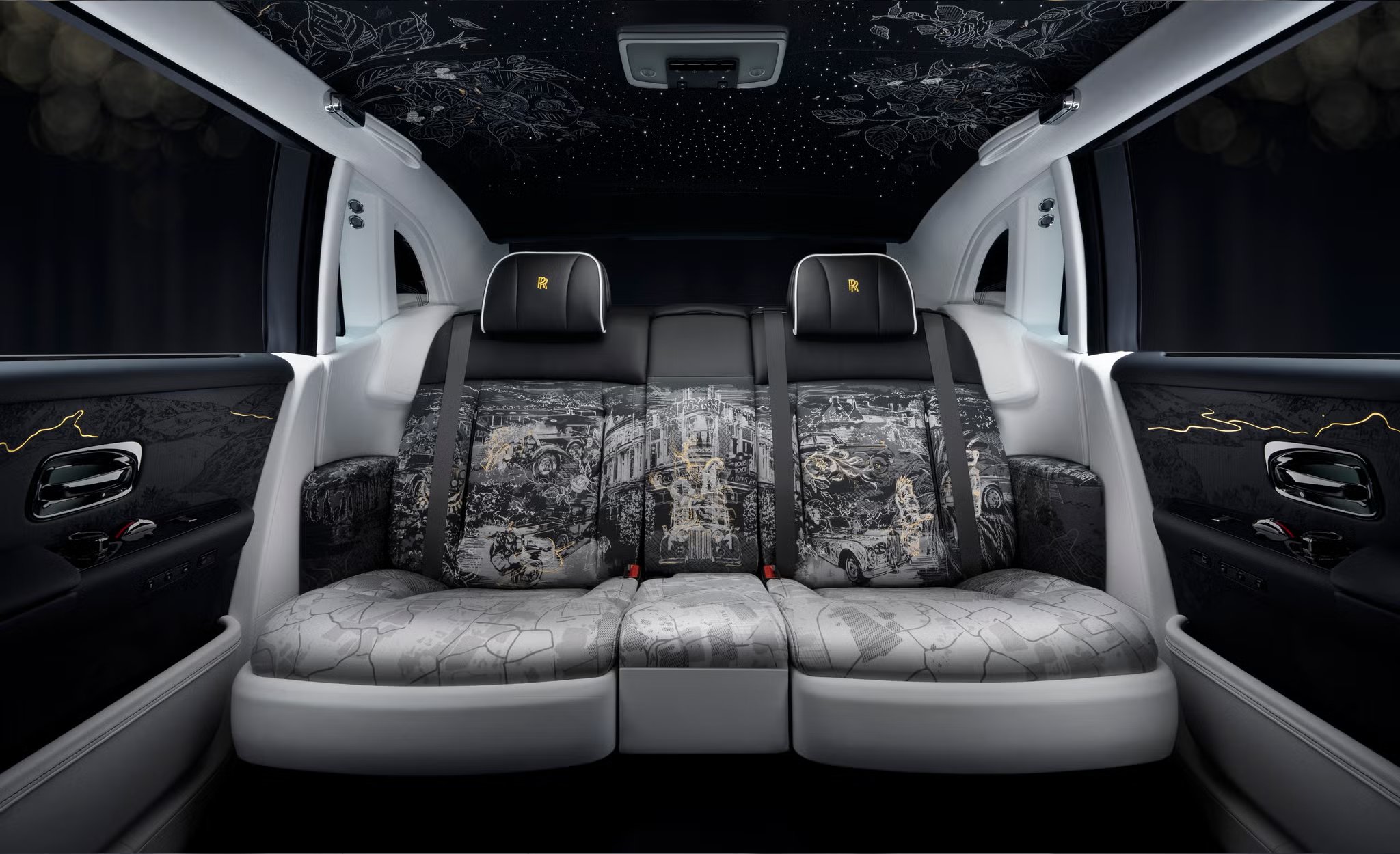 Inside, the cabin is a fusion of story and art, with every detail carefully crafted. The rear seats are inspired by the historic Phantom of Love (1926) and attempt to tell a story from the first generation Phantom to today's versions. The front seats are laser-etched with historic Phantom codenames such as "Roger Rabbit" and "Seagull."